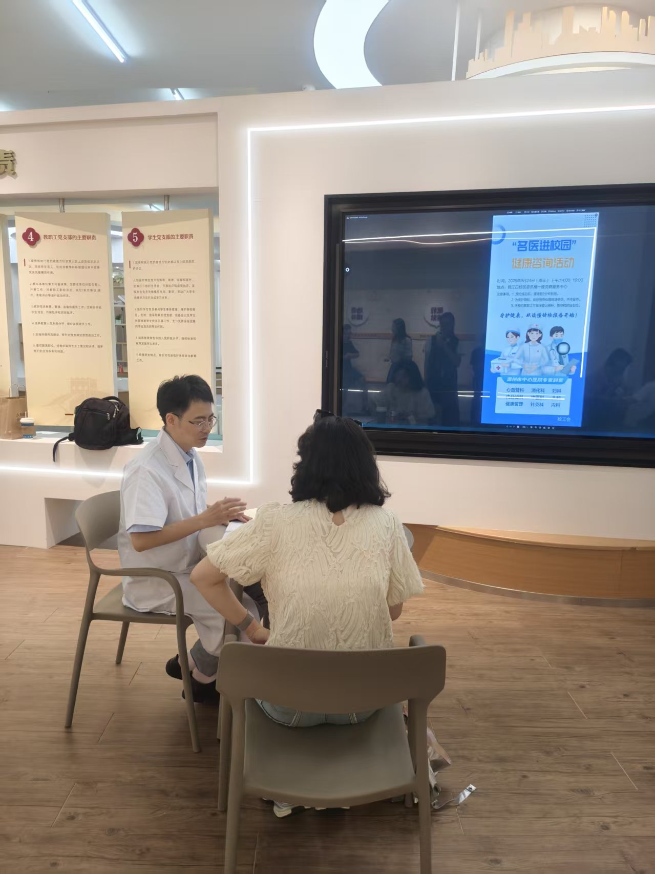 一句句专业的分析,一声声关切的叮嘱,交织成这个下午最动人的旋律。每位教职工都享有和专家一对一的咨询时间,他们带着体检报告和积攒已久的健康疑虑而来,离开时,脸上大多露出了豁然开朗的轻松笑容。针灸科的体验区域更是排起了小队,简单的耳穴诊疗让老师们直观感受到了中医的独特魅力。